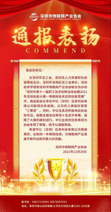 - >喜訊 | 深圳中億集團榮獲2021年深圳技能大賽——物聯網技術應用競賽個人三等獎! 2021-11-30