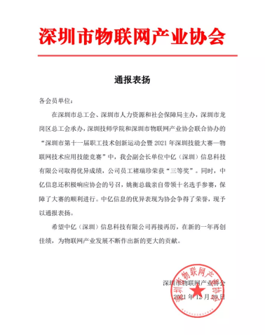 【新聞速遞】我司受深圳市物聯網產業協會書面通報表彰!