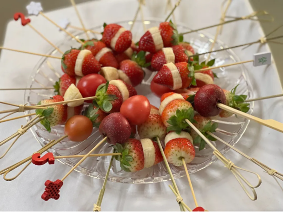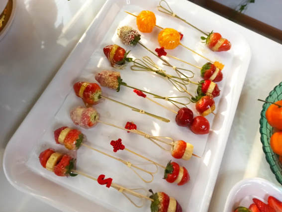 串水果,不僅把各種各樣的水果都串得牢牢的,連顏色也搭配得特別漂亮,一串串水果光是看著就讓人流口水;